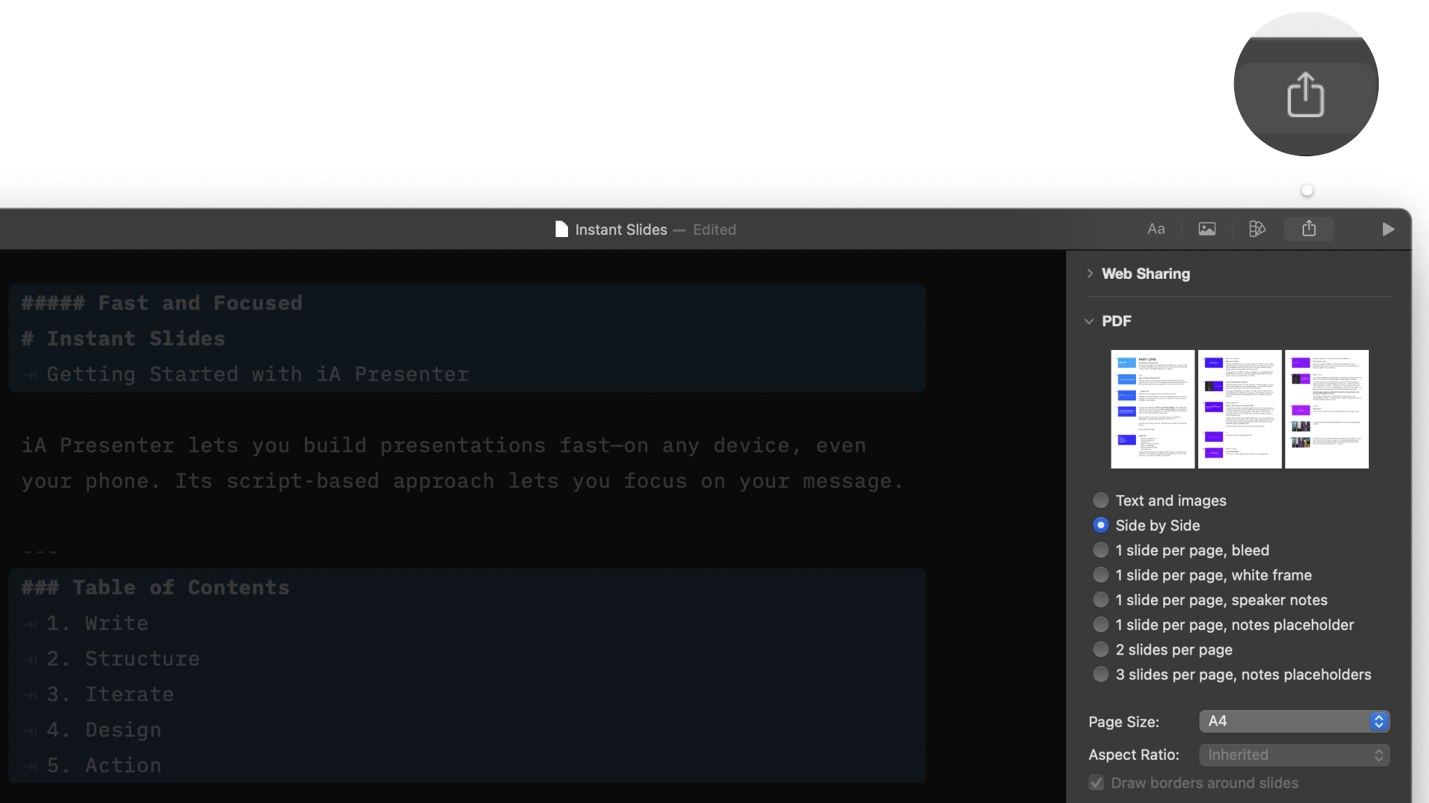 Once you’re done presenting, you can easily export your presentation and speaker notes as web link, printouts, files that you can use to publish online—or make them shareable in other apps. To view export options, open the Share Presentation tab on the right side of the Inspector. Alternatively, go to File → Export in the