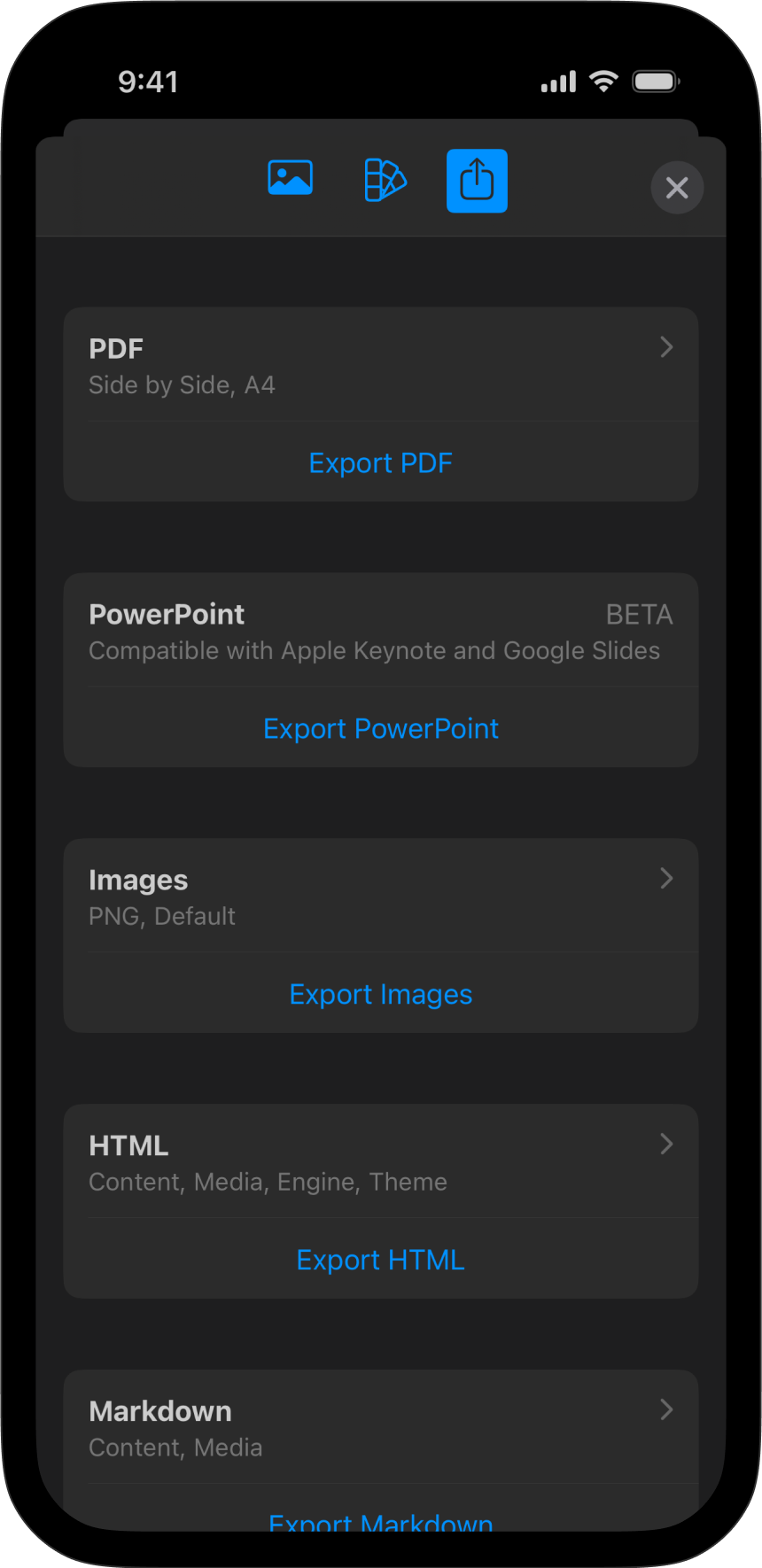 Once you’re done presenting, you can easily export your presentation and speaker notes as printouts, publish them online, or make them shareable in other apps. You can export your files either from: The Editor by tapping the iOS sharing button The Library, with a long press on a file and select Share PDF Export PDF