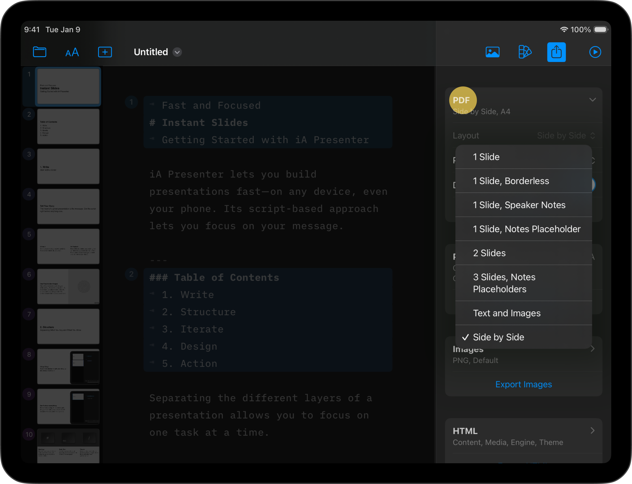 Export your slides as .png or .jpeg images to easily integrate them into other apps. You can add a prefix to the file names to better organize them.