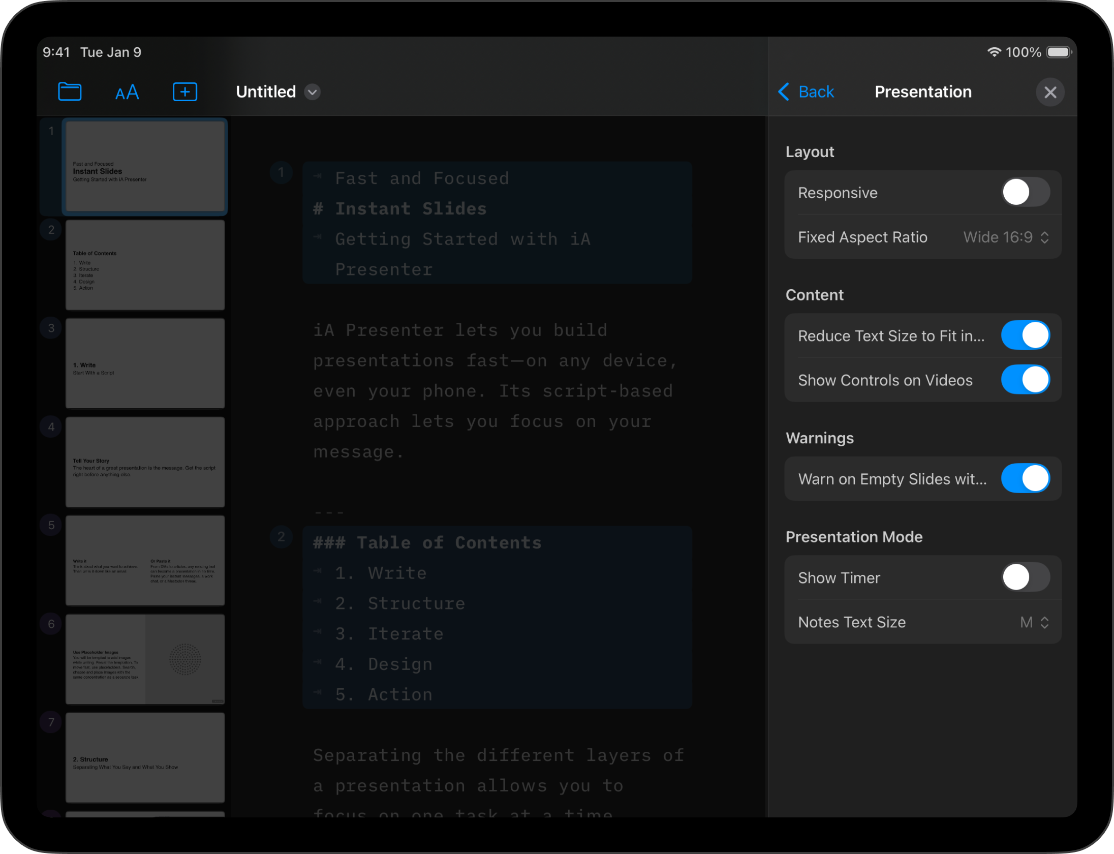 Also known as the teleprompter, Presentation Mode is the second primary interface in iA Presenter, alongside the Editor. This is where you practice your speech and deliver it during the actual presentation. The teleprompter is like a safety net that shows your notes on top of your slides.
