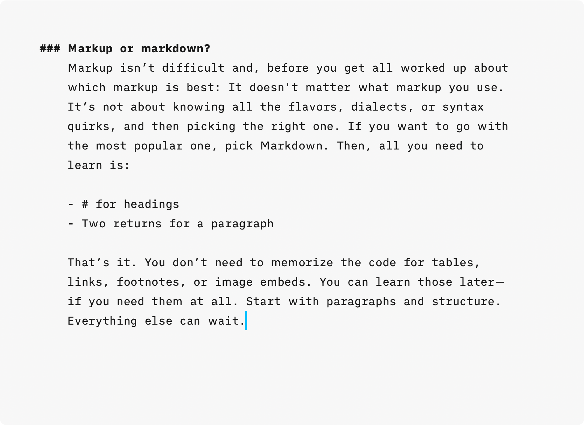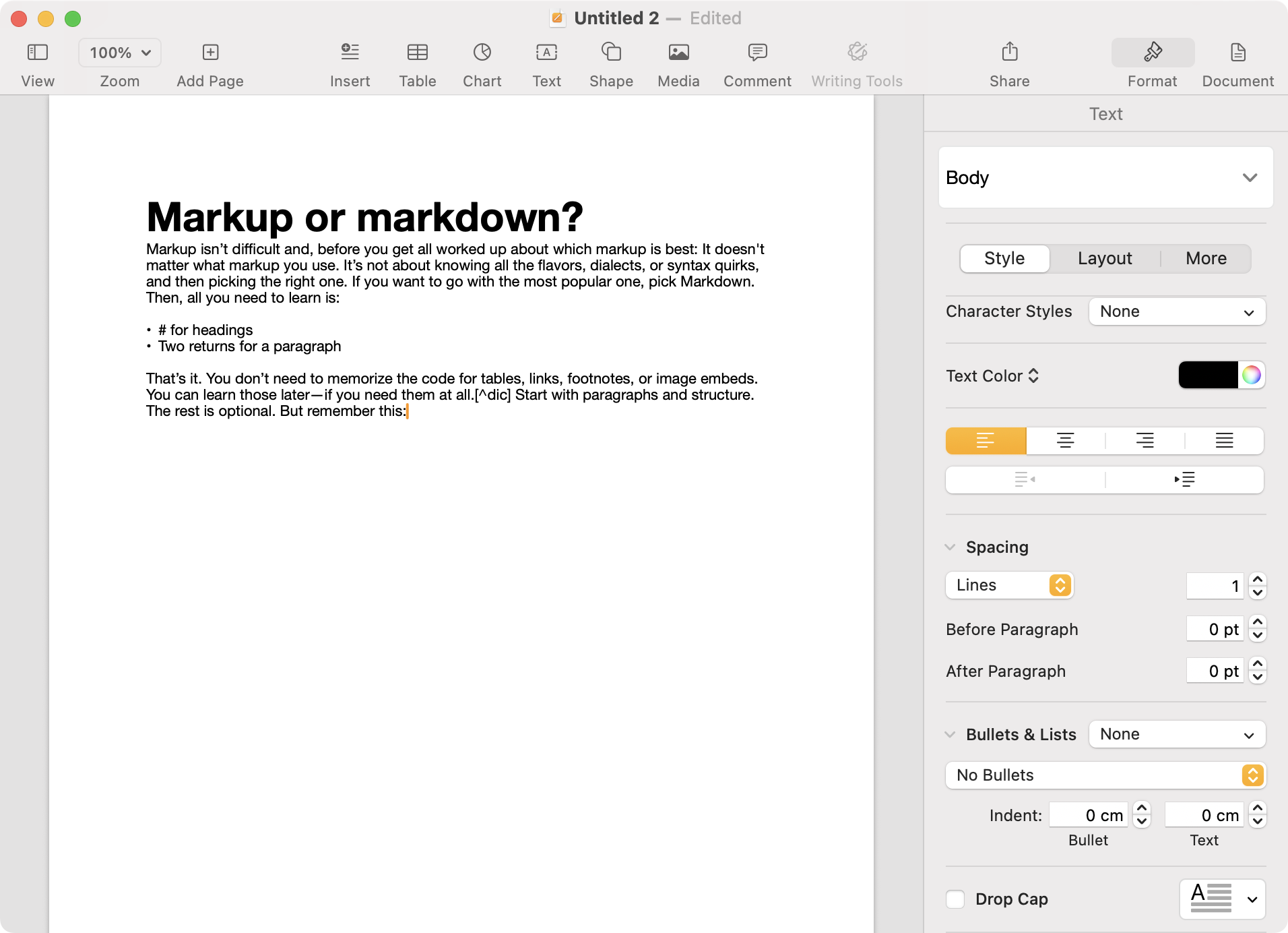 Markup can help you focus—if you keep it light. Don’t overload your first draft with links, images, or formatting. For early writing, paragraphs and headings are enough.