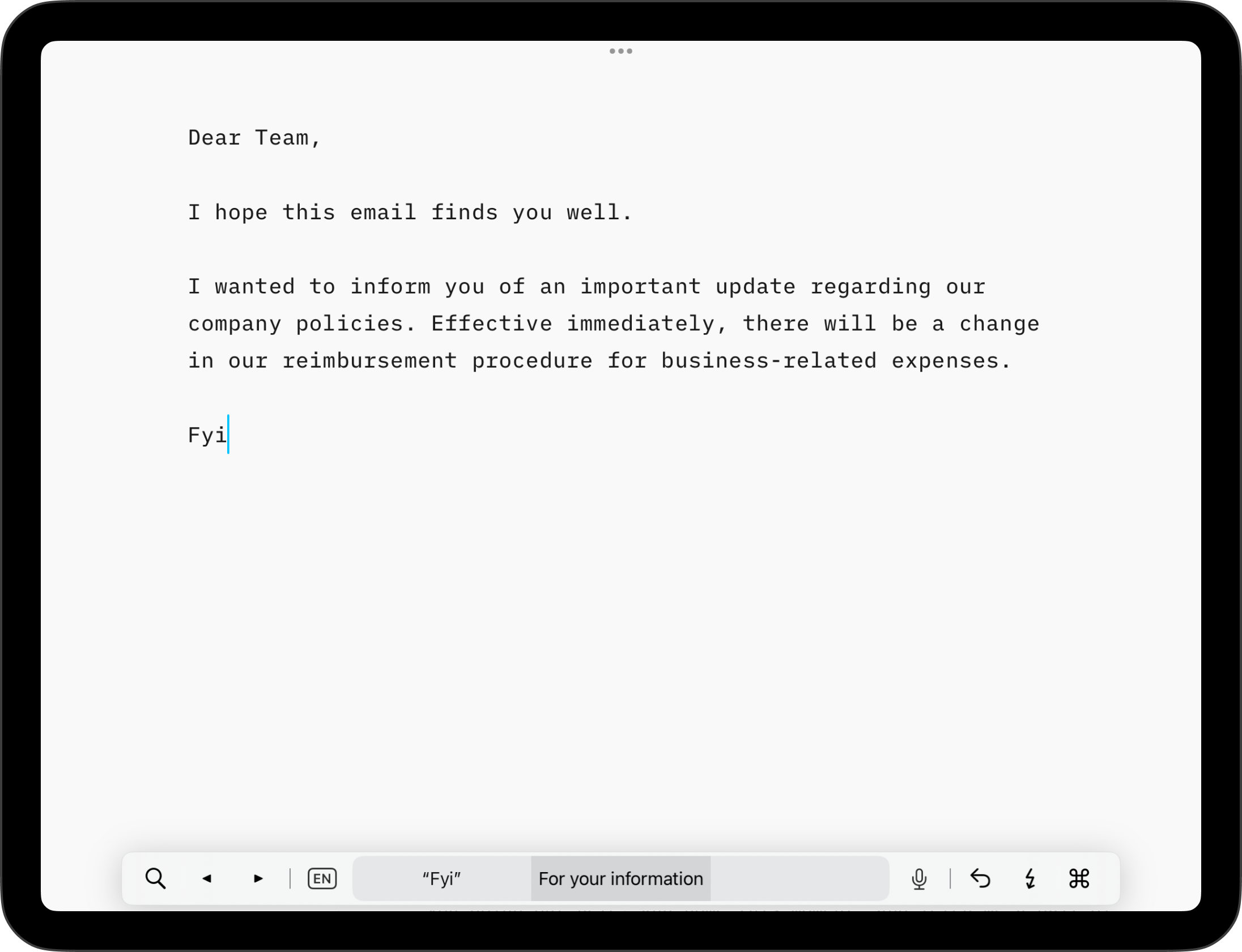 Text replacement boosts your writing speed: designate a word (typically an abbreviation) and the corresponding word or phrase that it should automatically input. For example, when you type “FYI,” it will be replaced with “for your information.”