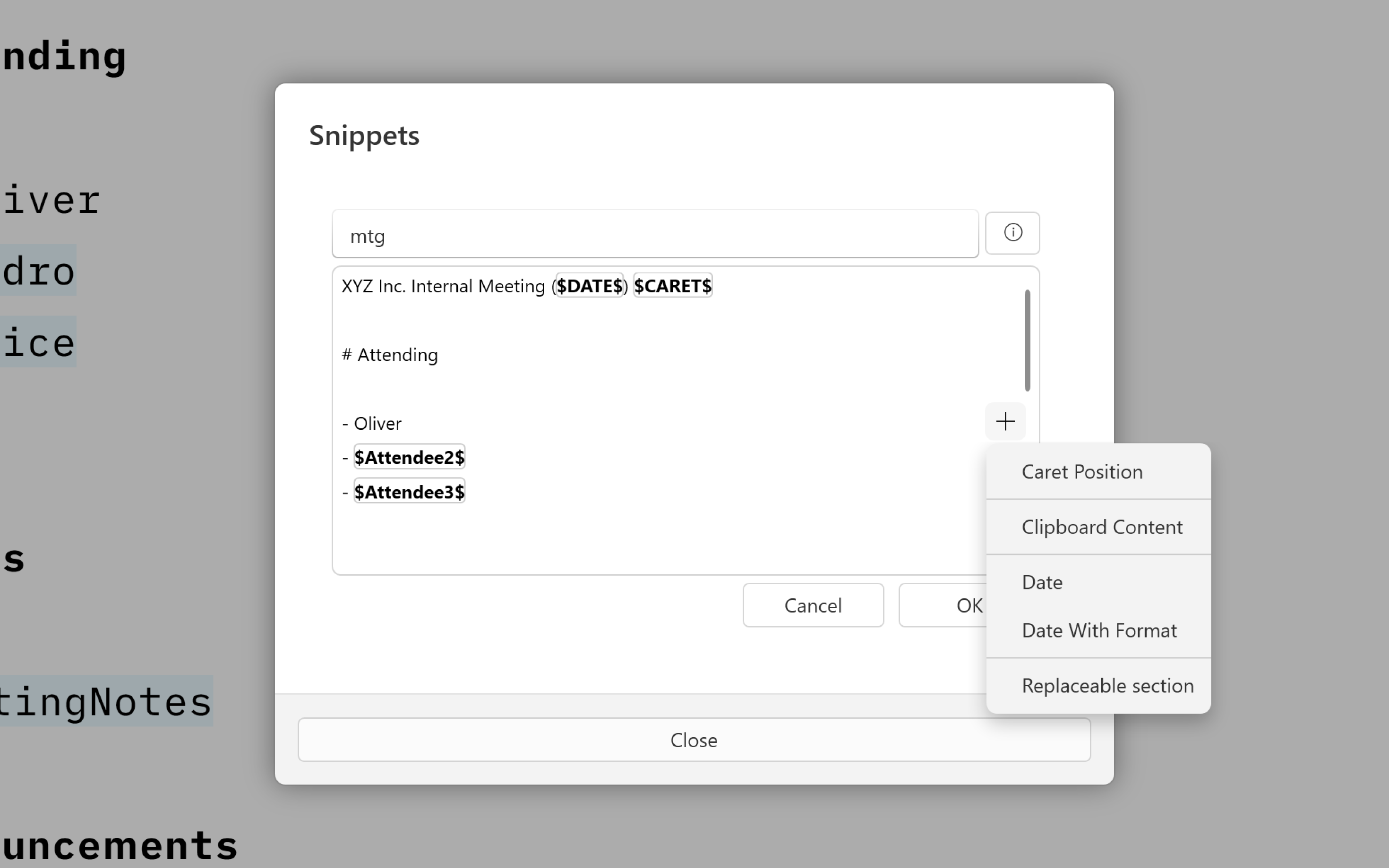 This functionality, available at the OS level, is supported in iA Writer. Simply enter your desired texts and their corresponding replacements in your Apple Settings, and they will seamlessly integrate with iA Writer.