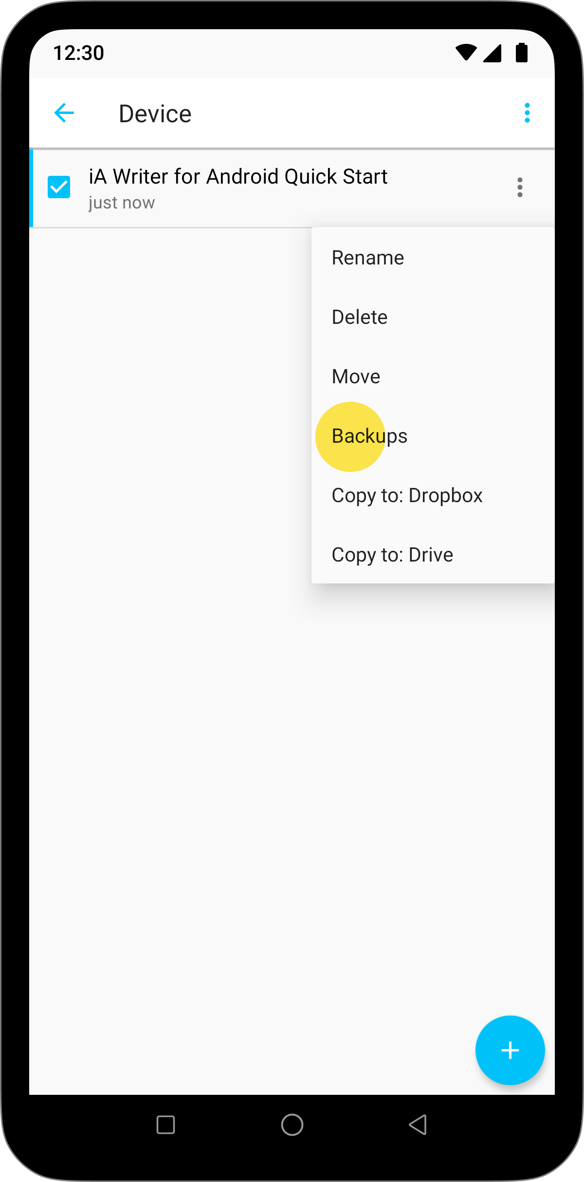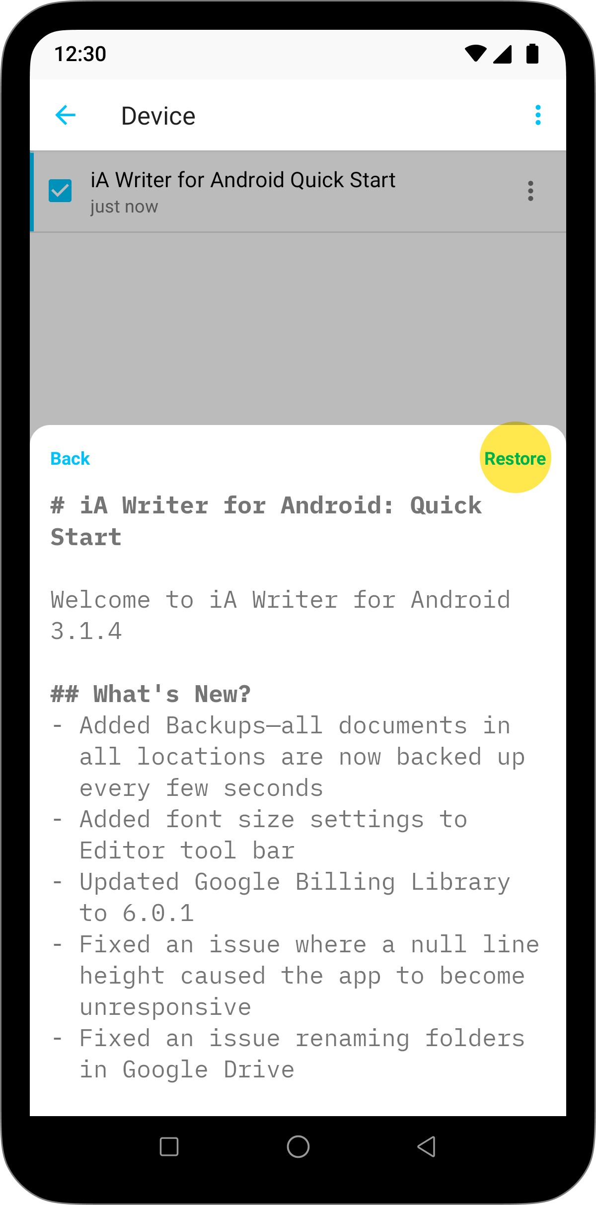 Be it due to poor cloud sync behaviour or other issue, iA Writer for Android includes a built-in local backup of edits, just in case.
