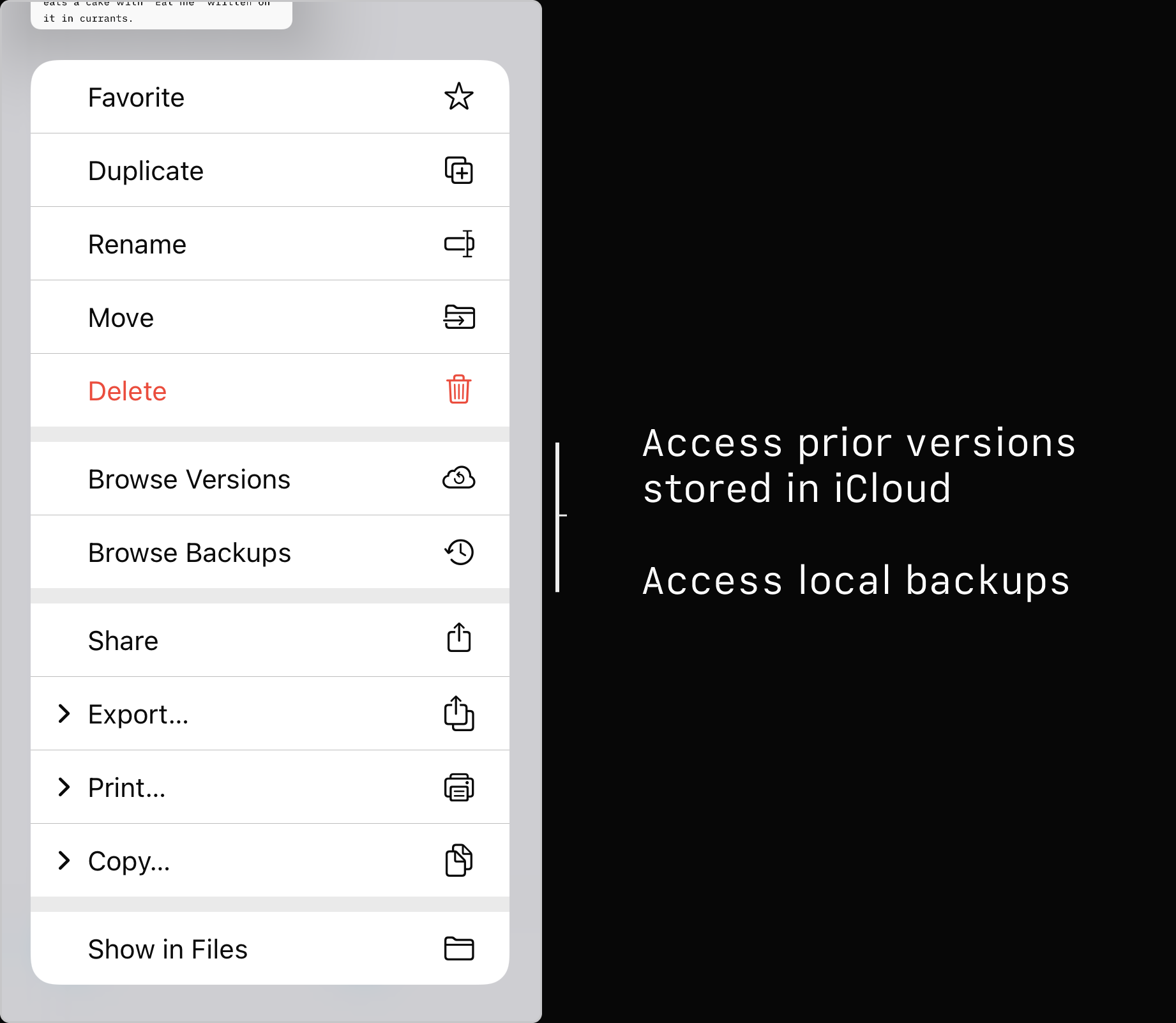 You have various options to recover your previous work, either through the iA Writer app or iCloud. iA Writer for iOS comes with built-in support for iCloud Drive. In addition to the advantages of document synchronization across devices, users also benefit from the extra security provided by online recovery tools available in iCloud.