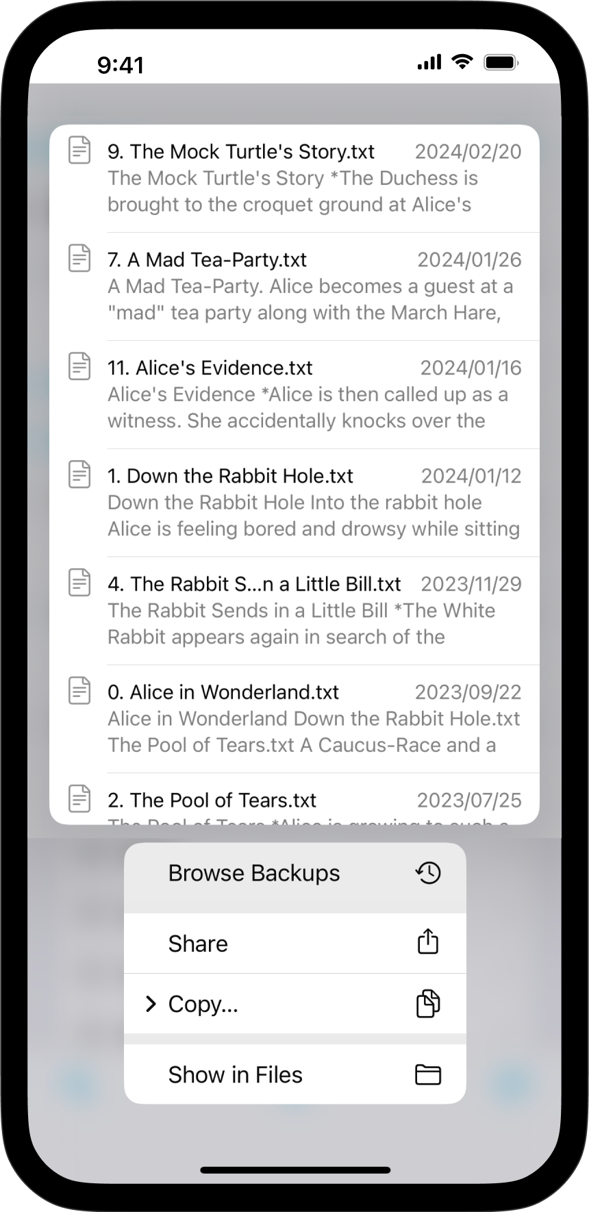 To locate a backup, just like for versions, long-press on a file in the Library then select Browse Backups (sweep upwards to reveal the option if necessary).