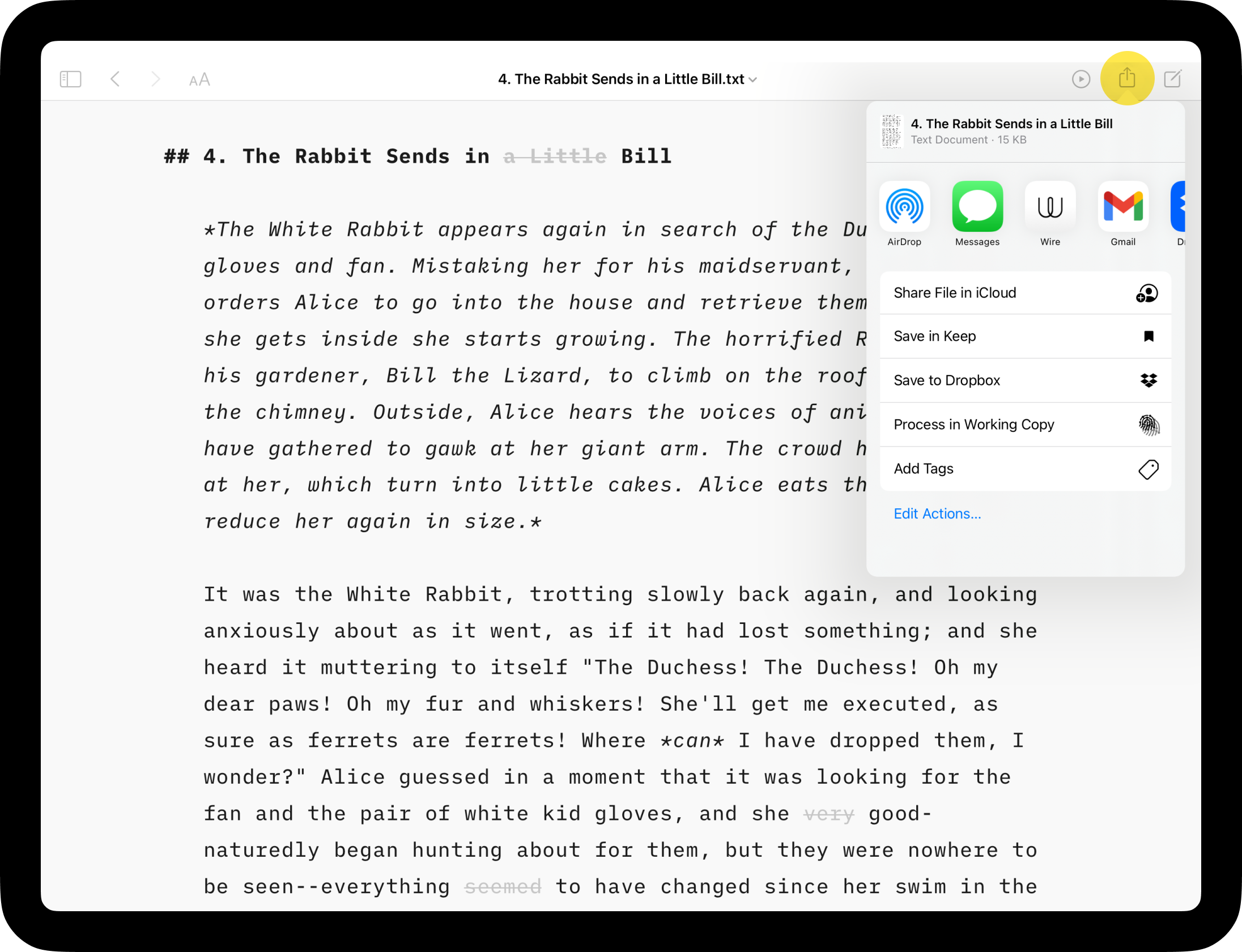 To share the whole file, tap the iOS sharing button and select the destination.