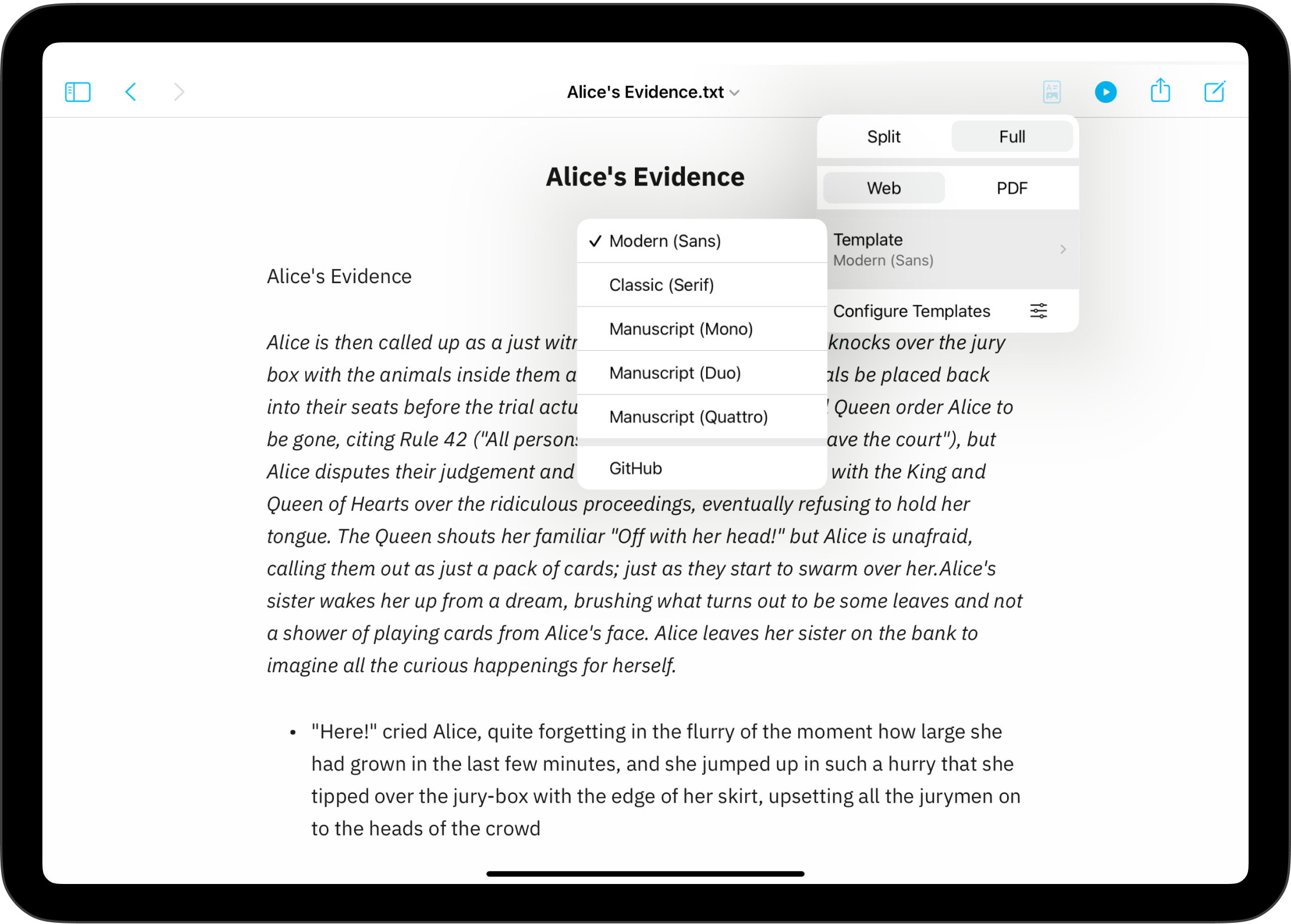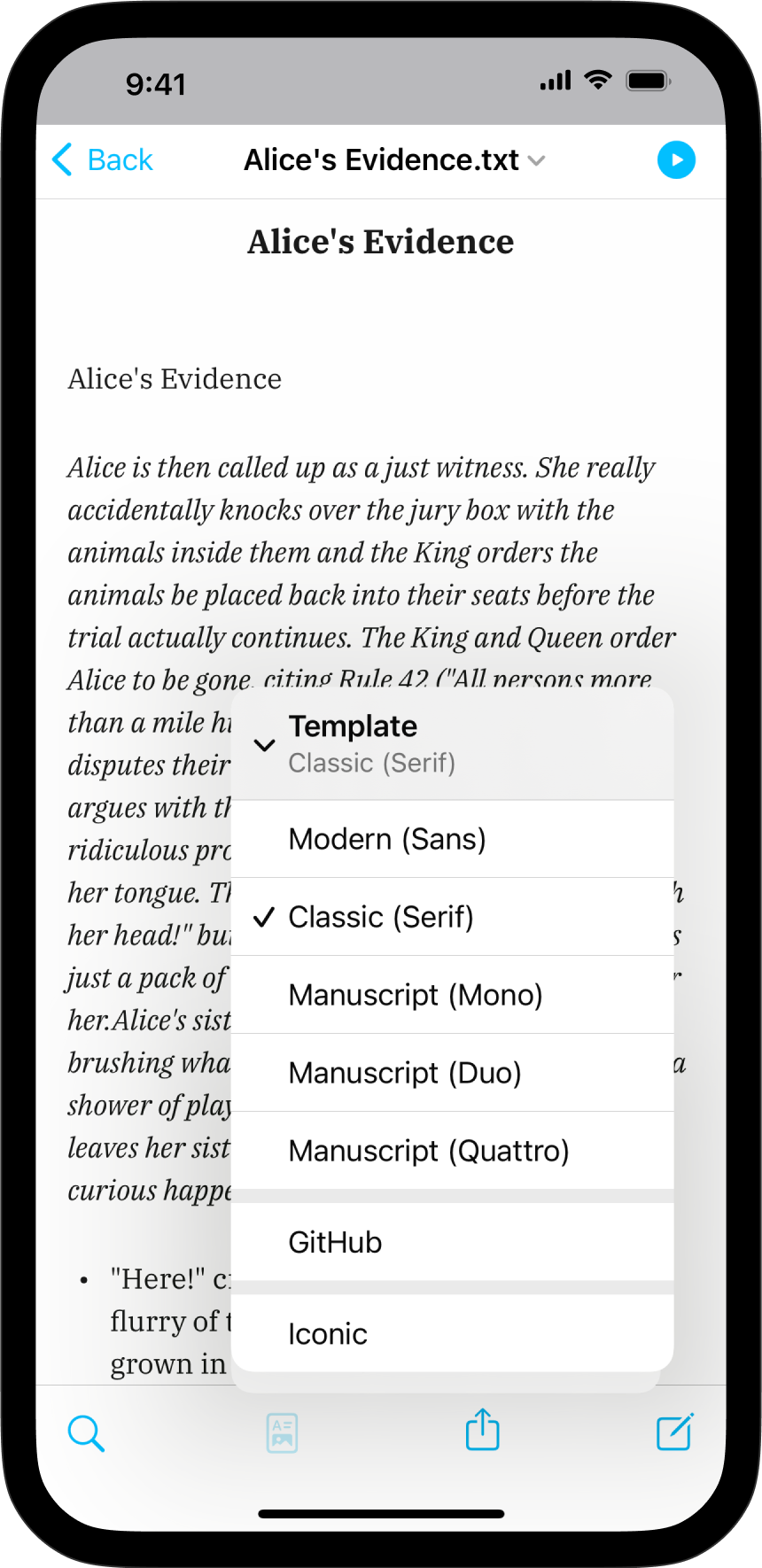 Preview, create PDFs, and print documents in your own style with templates in iA Writer for Mac.