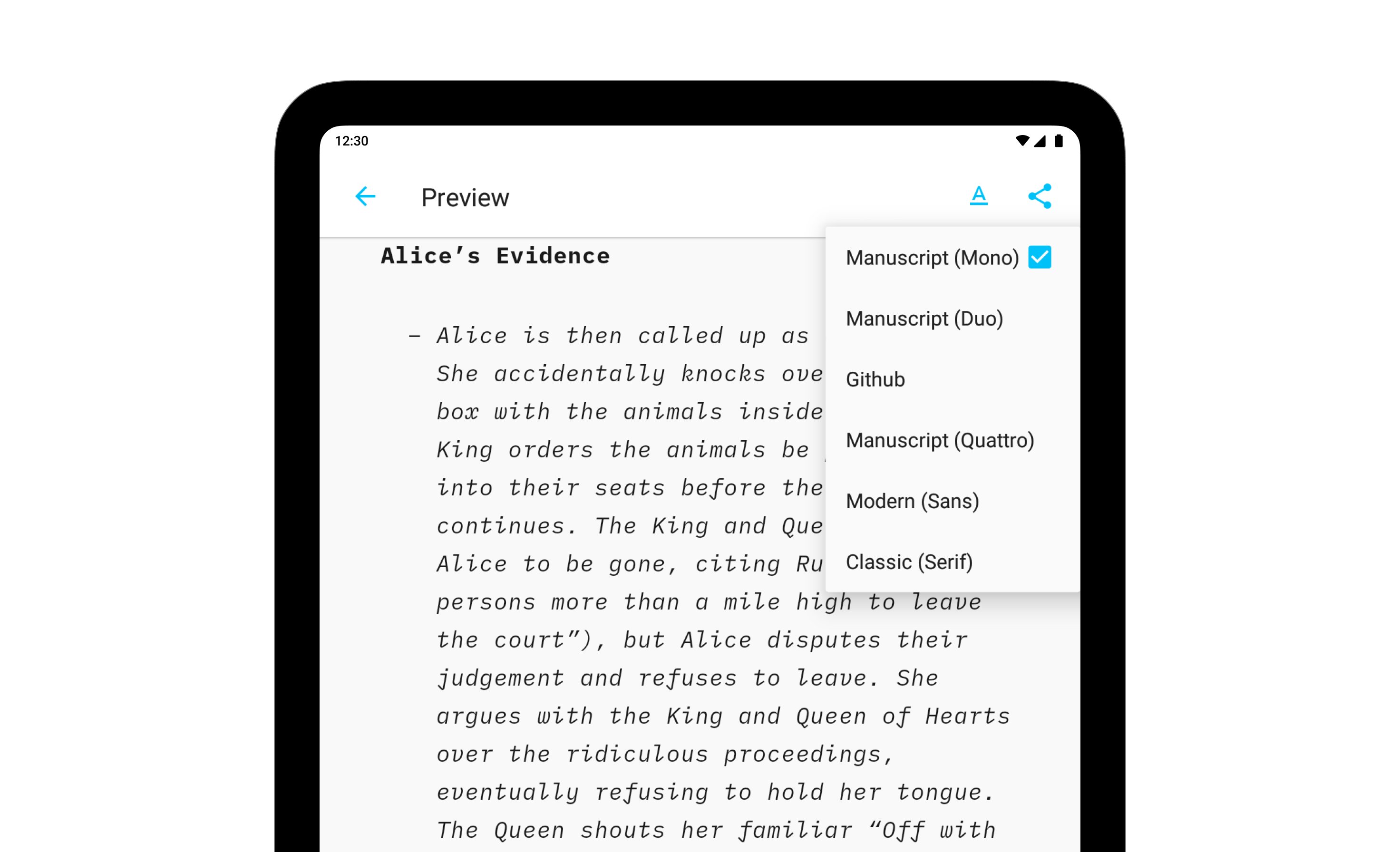The templates determine the style of your text in Preview and Print with elements such as the fonts, the margins, the line height, etc…