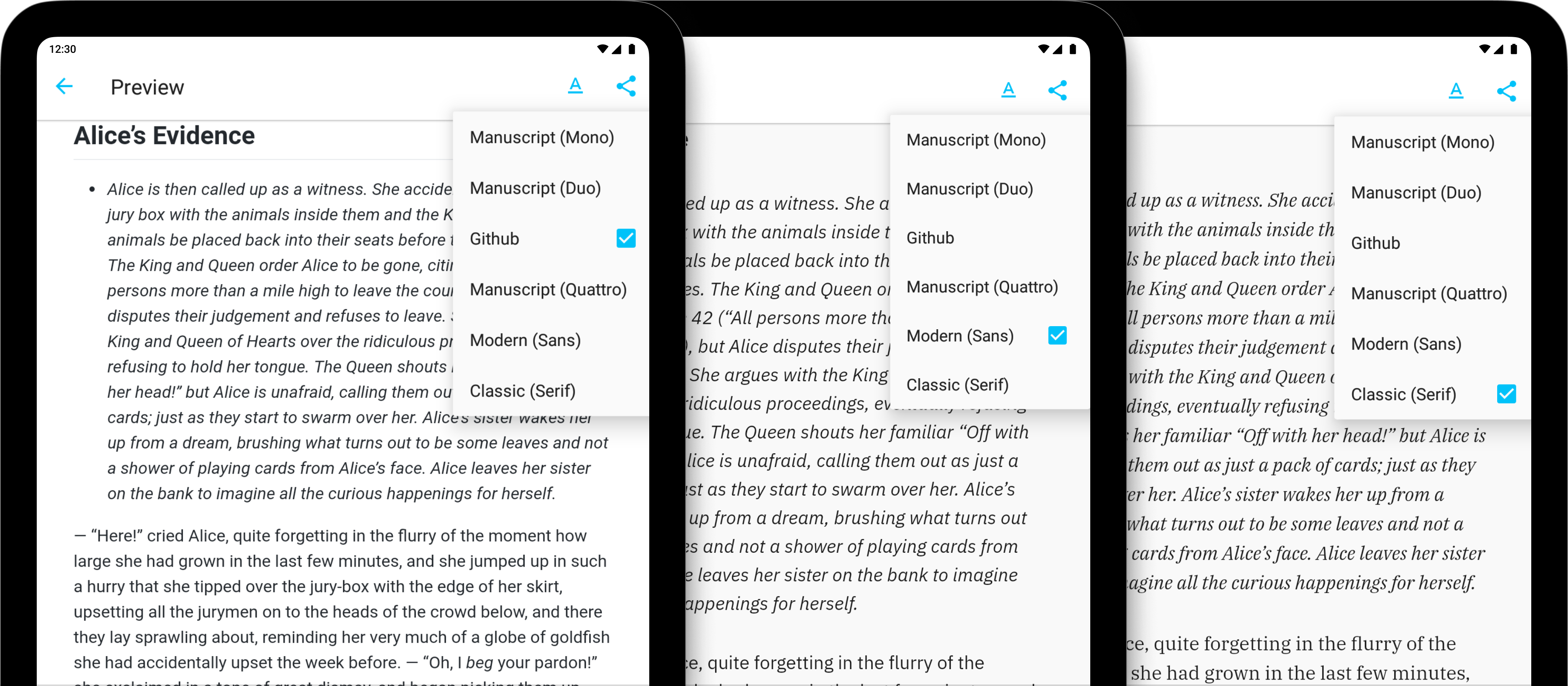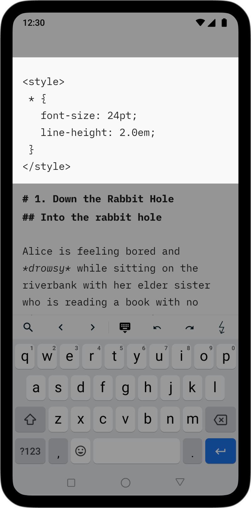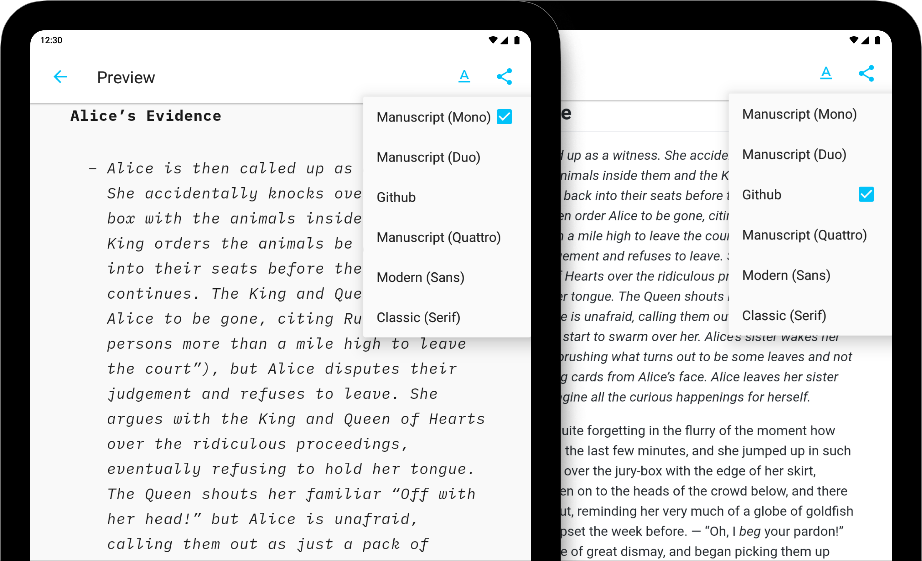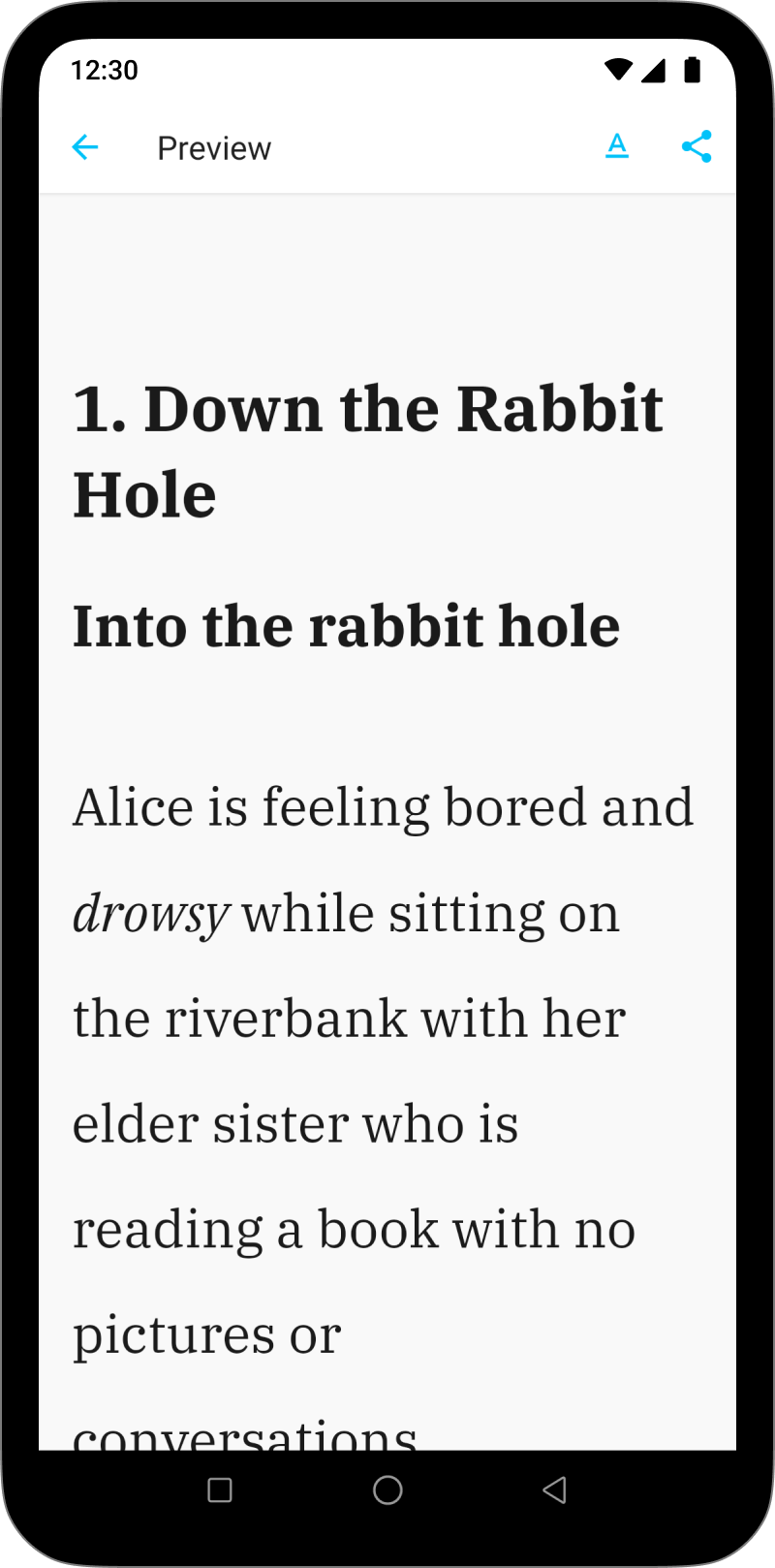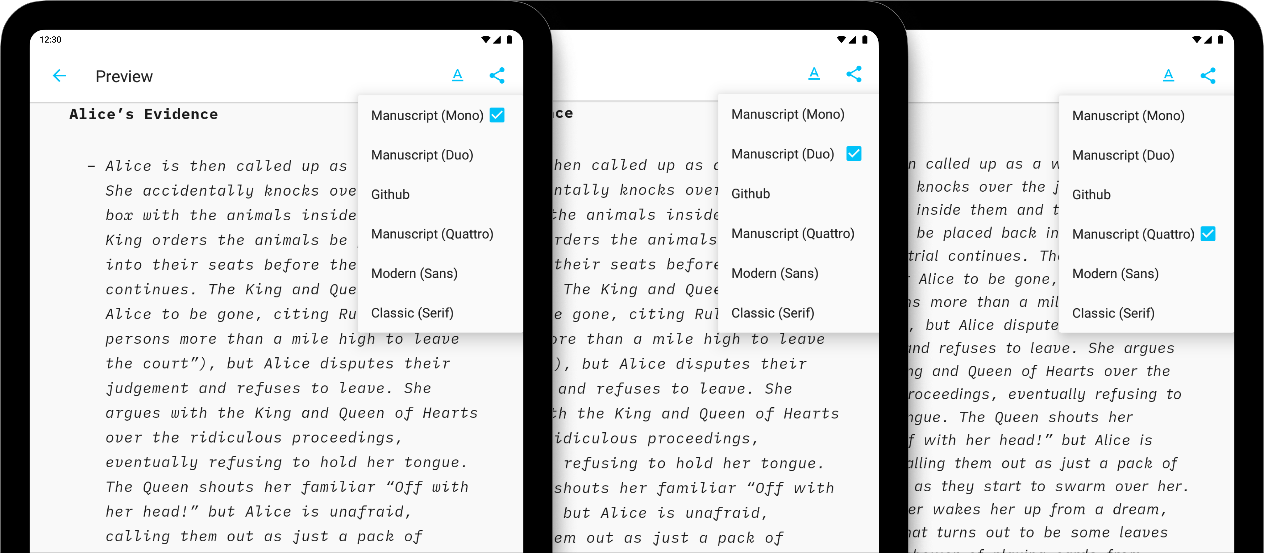 Preview, create PDFs, and print documents in your own style with templates in iA Writer for Android.